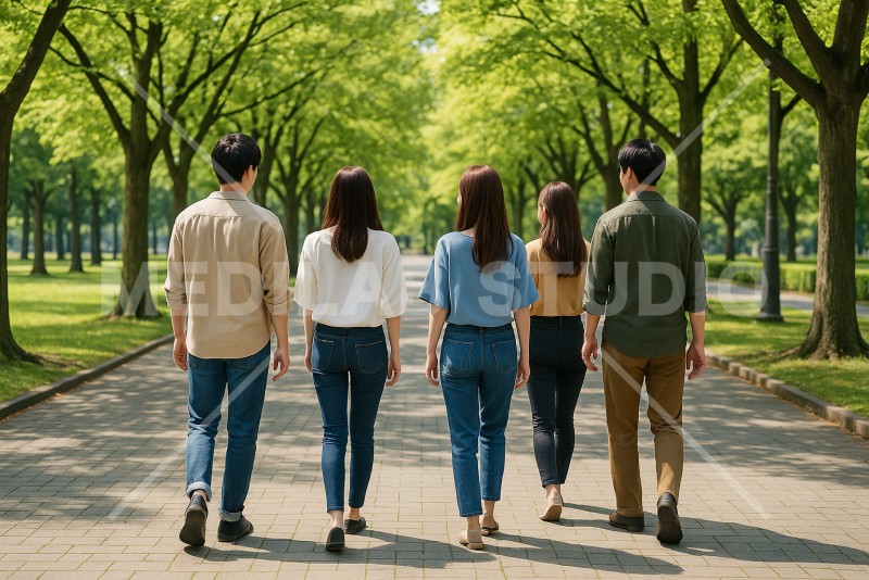 明るい並木道を歩く男女友人グループの後ろ姿