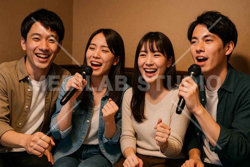 カラオケルームで楽しんでいる20代の友人グループです。