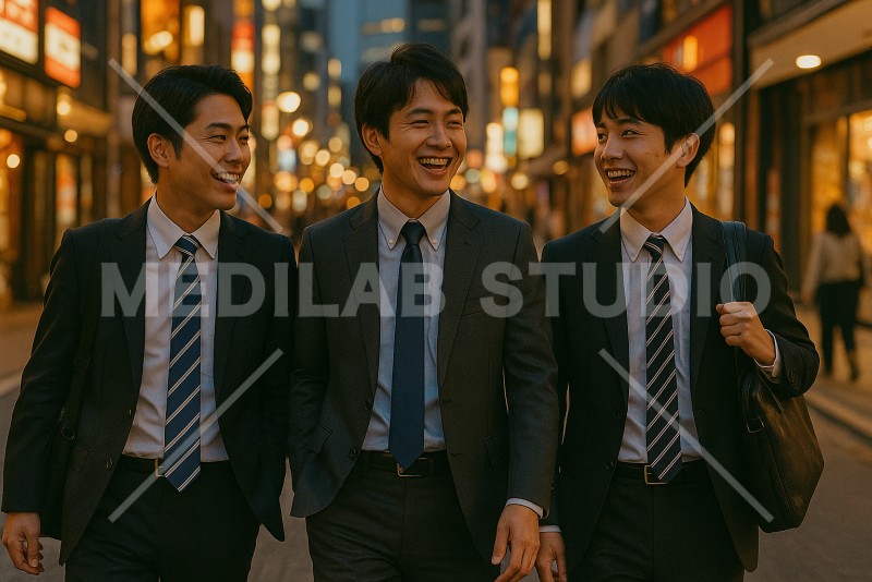 20代の男性友人3人グループが、夜の繁華街で楽しそうに歩いている様子です。