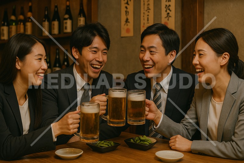 会社員の男女グループが、仕事帰りに居酒屋でビールで乾杯している様子。