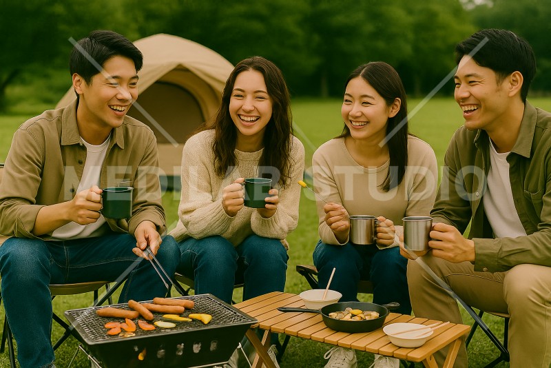 キャンプに出掛けた20代の友人グループが談笑している様子