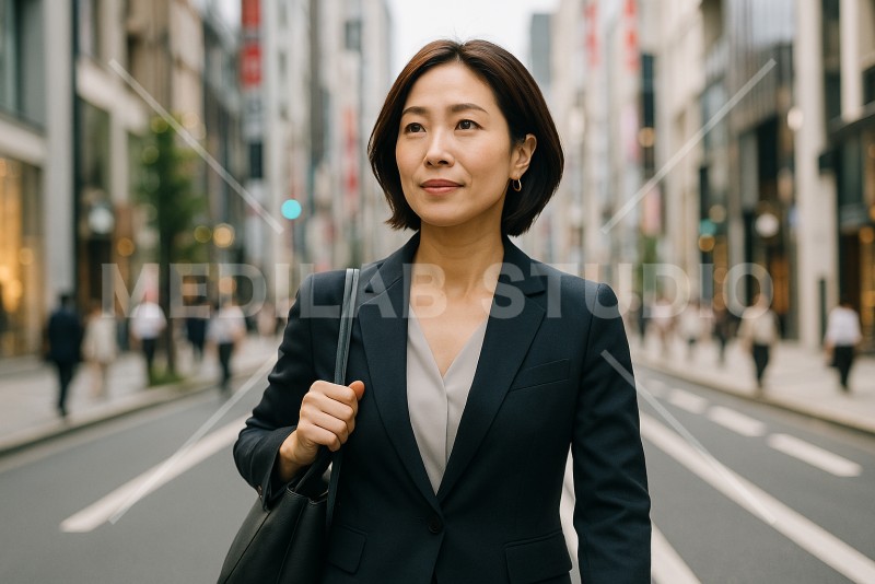 40代のキャリアウーマン女性がオフィス街を歩いている様子です。