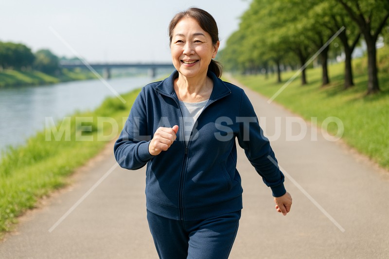 50代の女性が健康維持のために河川敷でジョギングをしている様子です。