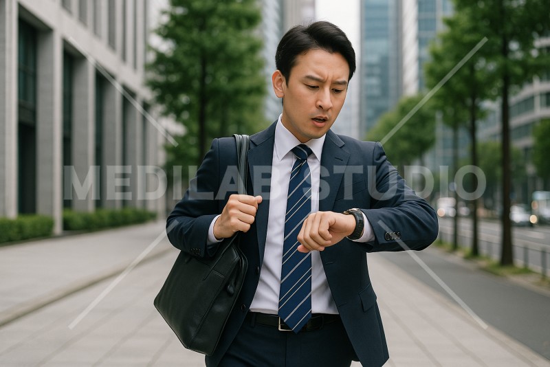 20代サラリーマン男性が時間を気にしながらオフィス街を歩く様子