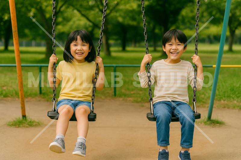 小学生の子ども2名が、ブランコで遊んでいる様子です。