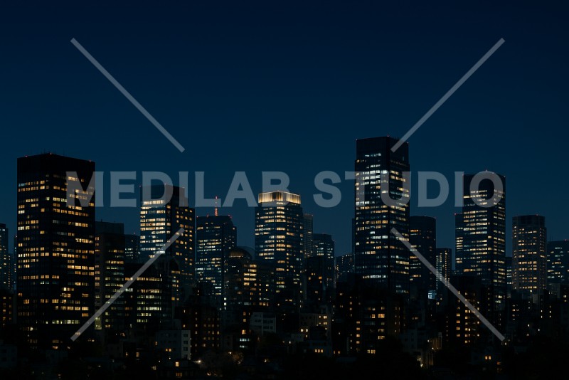 都会のビル街の夜空です。多くのビルはまだ明かりが灯っていて、眠らない都会を感じさせます。