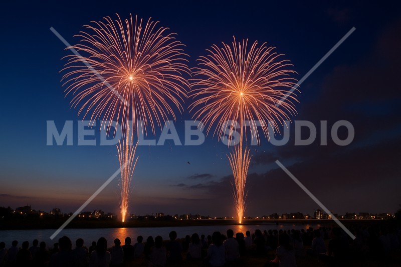 夏の夜空に浮かぶ、大きな2つの花火
