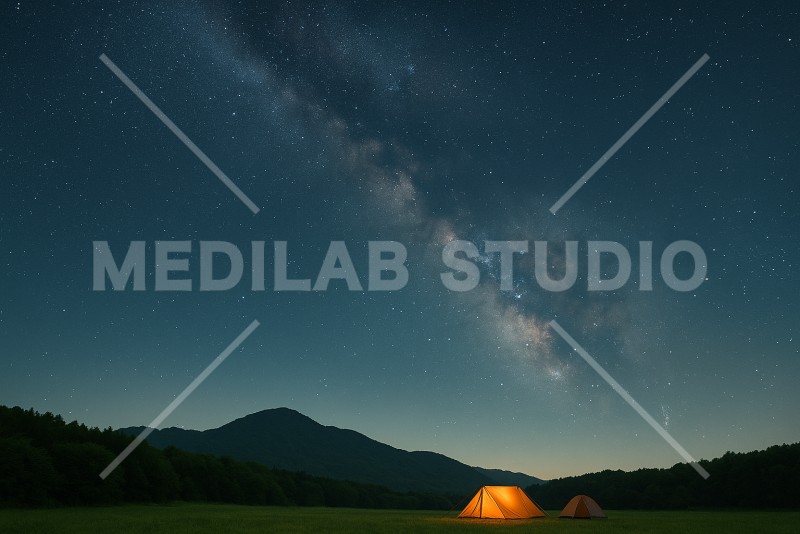 キャンプ場の夜空に、美しい星がたくさん浮かんでいる様子です。
