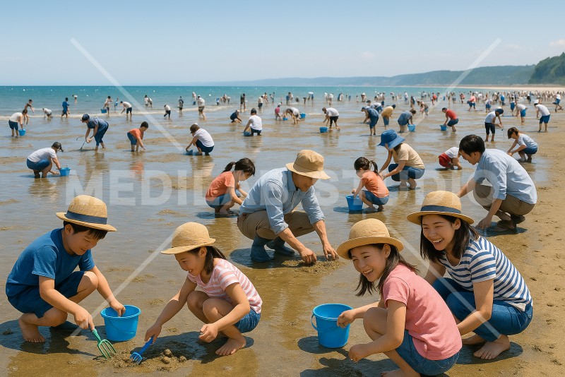 初夏の海岸で多くの人たちが潮干狩りを楽しんでいます。子どもも大人も参加している様子です。