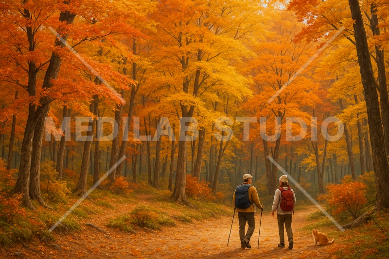 秋の美しい紅葉の風景の中で、ハイキングを楽しんでいる2人。