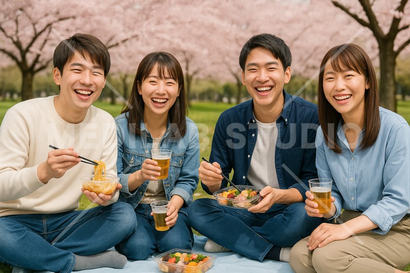 春、若者グループがお花見を楽しんでいる様子