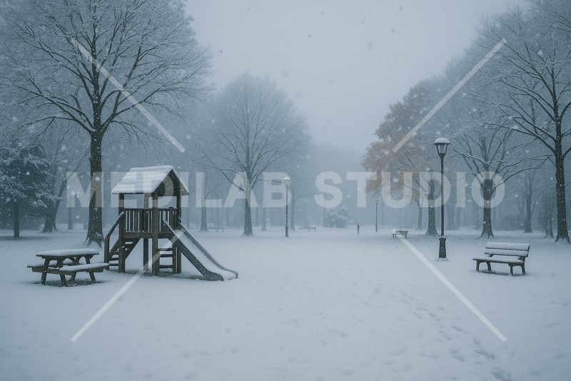 降雪したあと、児童公園に真っ白な雪がつもっている様子です。遊んでいる子はまだいない。