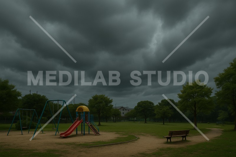 今にもゲリラ豪雨が降りだしそうな児童遊園の空の様子です。