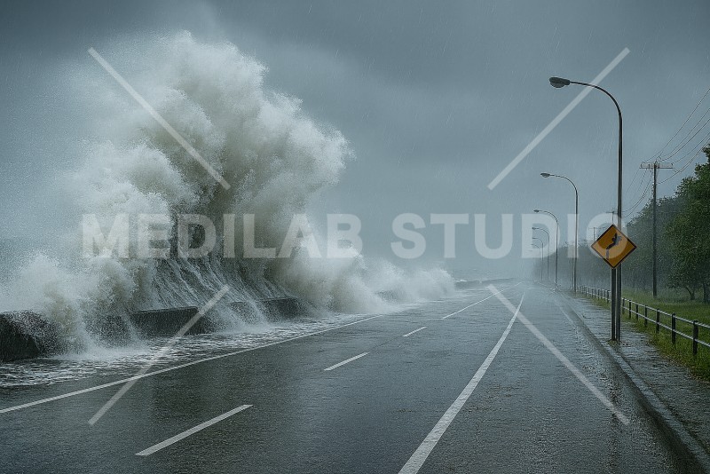 台風が来た日、大きな波が押し寄せる海沿いの車道