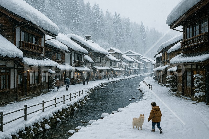 木造建築が立ち並ぶ温泉地の街並み。雪が降る中で伝統を感じる風景。