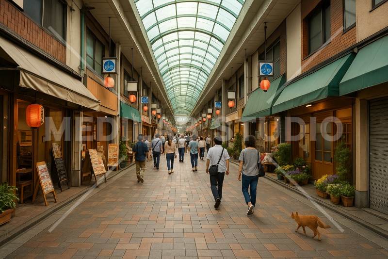 下町の都市にあるアーケード式の商店街の街並み