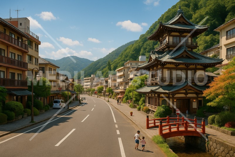 温泉や観光で有名な地域のメインストリートを表した街並み。