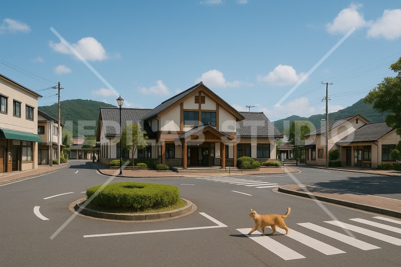 田舎の駅前の街並み。広いロータリーがあり静かな雰囲気。