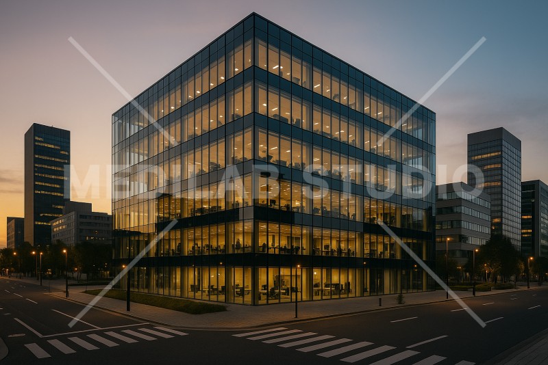 都心に建っているモダンで近代的なオフィスのイメージ。夜は煌々と明かりがともる。
