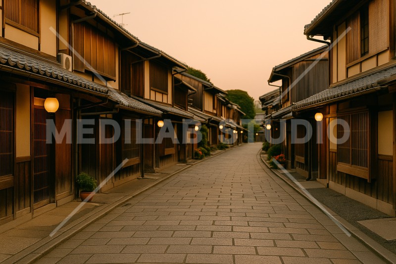 日本の伝統的な木造建築が建ち並ぶ街並み。夕暮れ時に温かい灯りがともっている。