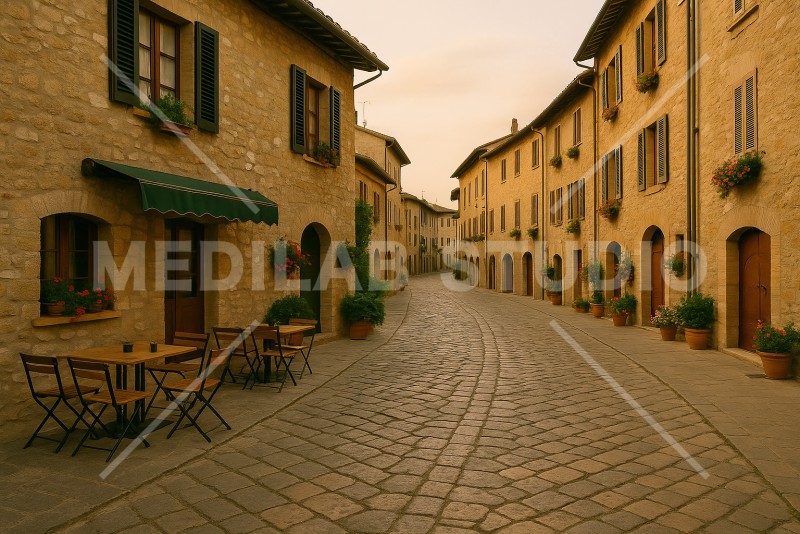 海外にある伝統的な建物が並ぶ、田舎町の街角を表す光景です。