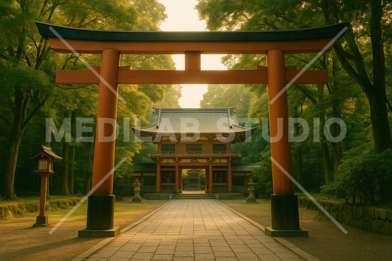 日本の歴史ある神社の鳥居。木漏れ日が当たり神々しい雰囲気を醸し出している。