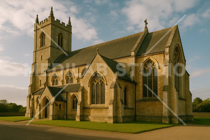 海外にある、伝統ある教会の外観。静かな雰囲気。