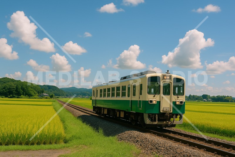 春ののどかな田舎の風景の中を路面電車が走行している様子です。