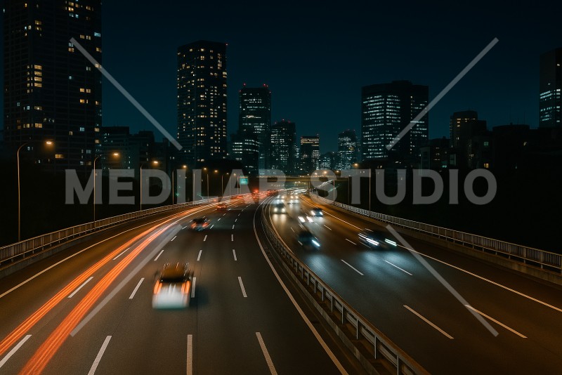 夜間に都心を走る高速道路の様子です。都会の夜景の中を走るイメージ。