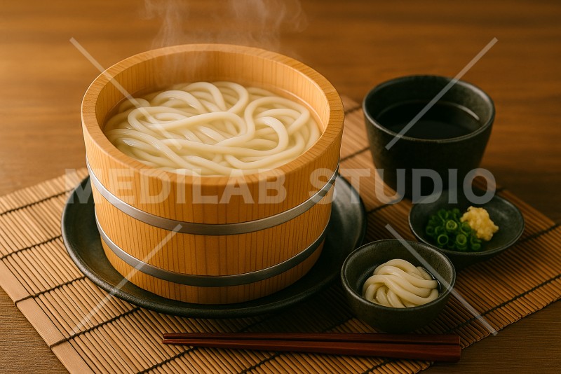 のどごしが良くおいしい釜揚げうどん。茹でたてでしっかりと白い湯気が上がっている様子です。