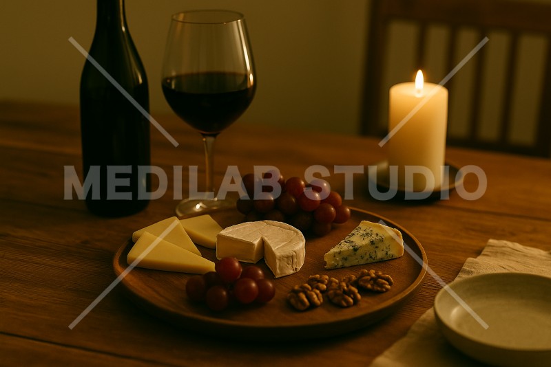 赤ワインで晩酌を楽しむ人のおつまみセット。チーズやフルーツが乗っている。