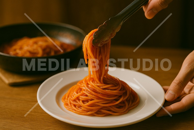 トマトソースのスパゲッティーをフライパンからお皿に盛り付けるところ。