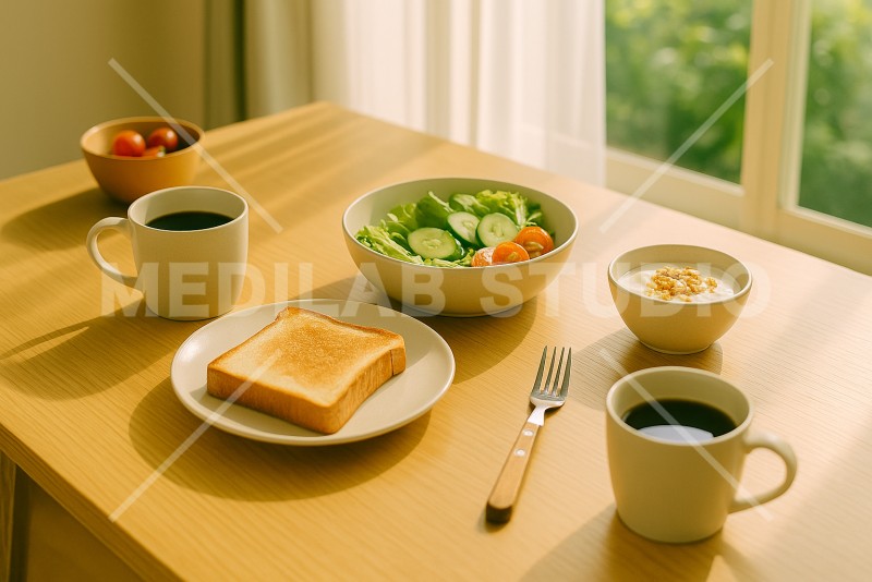 食パンをメインにした朝食。コーヒー、サラダ、ヨーグルト。隣にはパートナーの朝食も用意されている想定。