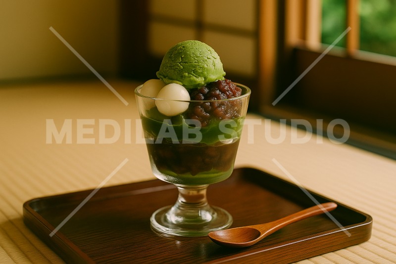 抹茶アイスや白玉、あんこを乗せた和風のパフェ。和室の雰囲気で。
