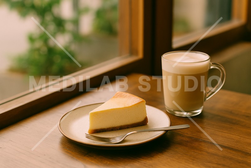 1ピースのチーズケーキに、まろやかな雰囲気のカフェラテを添えてカフェタイムをイメージ。
