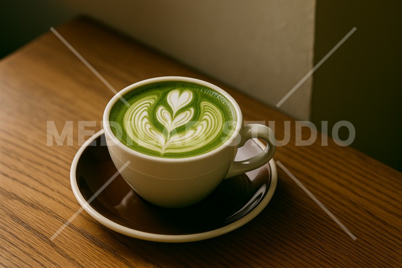 ホットの抹茶ラテ。繊細なラテアートが美しい。