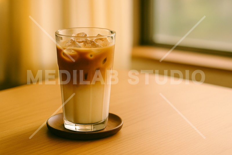 たっぷり氷が入ったアイスカフェラテ。窓から入る自然光で涼し気かつナチュラルな雰囲気に。