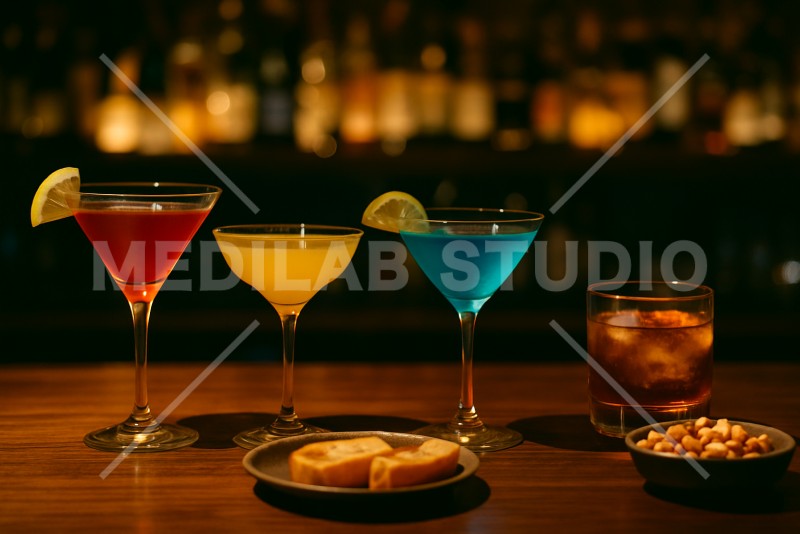 おしゃれなバーで飲む、カラフルなカクテル。小さなグラスでスタイリッシュな雰囲気。