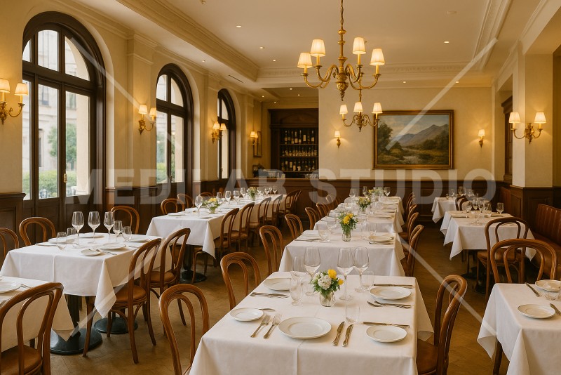 カジュアルな雰囲気が漂うフランス料理レストラン。ランチ時間帯のイメージ。