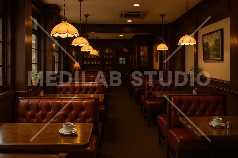 下町の一角にありそうな純喫茶の店内。特徴的な照明とアンティーク感があるソファーがポイント。