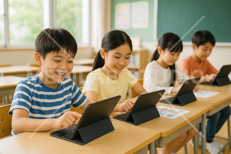 小学生の子どもたちがタブレット端末を使って学習している様子。楽しそうな笑顔。