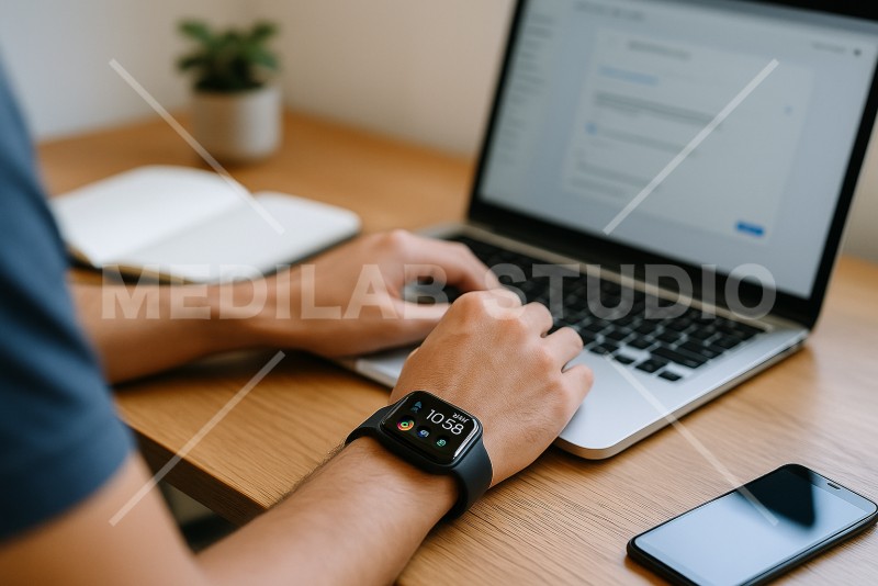PCを使って仕事中の男性がスマートウォッチを着用している手元。
