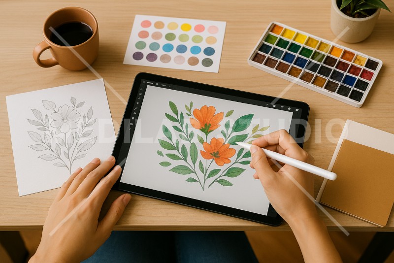 タブレット端末を使ってデザインをしている様子。パレットでカラーリングなどを確認中。