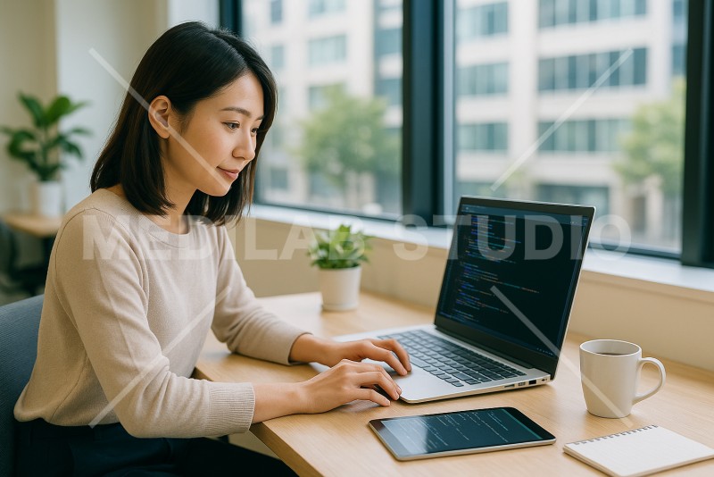 開放的なオフィスの窓際で女性エンジニアがプログラミング作業をしている様子です。