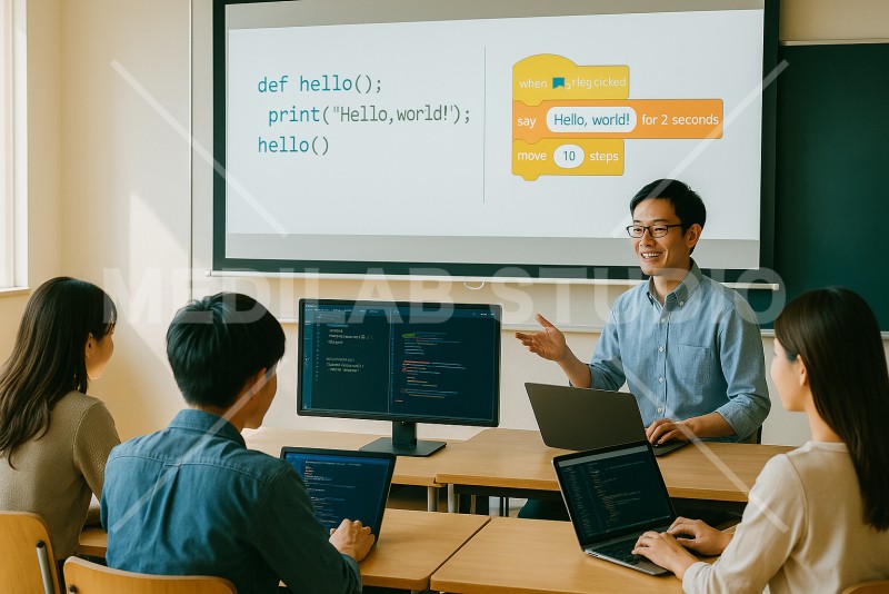 学校の授業でスクラッチに関する講習会を行っているところ。中高生を想定。