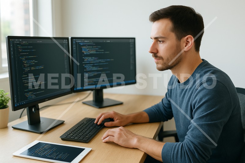 外国人のエンジニアが自宅でコーディングしている様子です。
