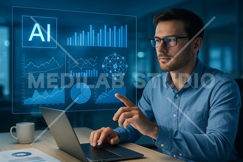 AIを用いるエンジニアが仕事をしている様子。AIを活用して思考をめぐらせているイメージ。