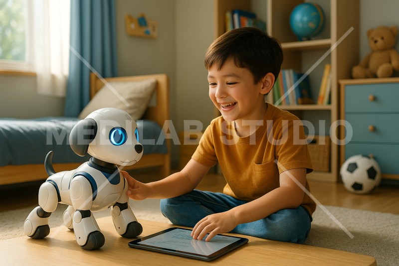 子どもがAI搭載のペットロボットで遊んでいる様子