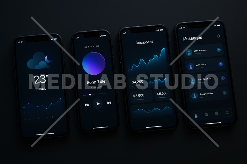 黒い背景メインの落ち着いたUI。さまざまな日常利用系アプリをイメージ。