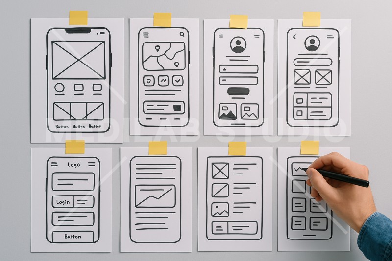 アプリのUIについて手描きで検討している様子。アプリの制作段階をイメージ。